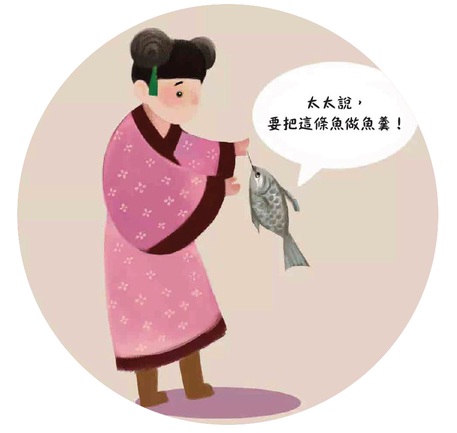 9. 好不容易等廚子休息了, 一個傭人拿了一條鯉魚走進廚房,說:「太太說,要用這條魚做魚羹,等她起床後,當點心吃。」