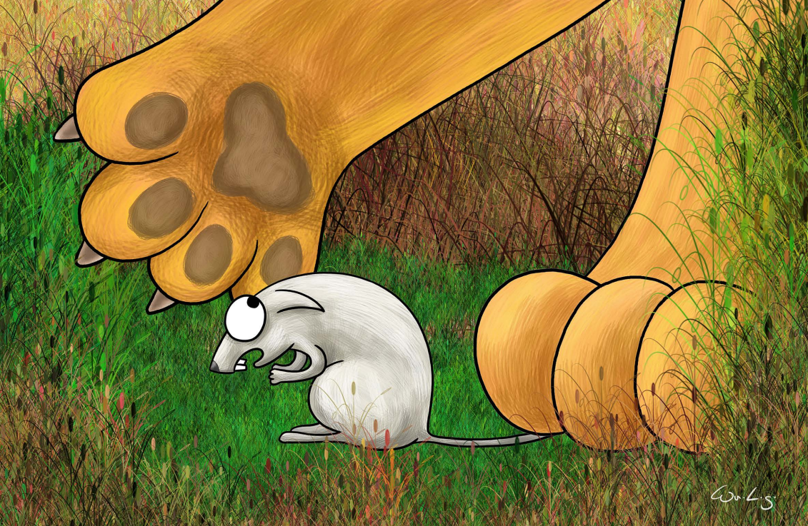 2. 巨掌襲來,獅子本能地抓住老鼠。小老鼠求饒:「獅子大大,饒了我吧!總有一天我會報答你的!」