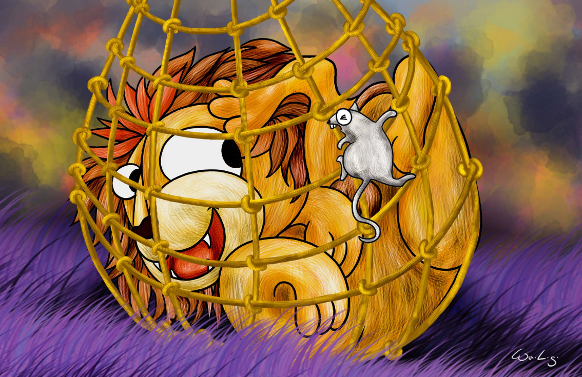 5. 路過的老鼠發現後,說:「獅子大大別怕,我來幫你!」並迅速地啃起了繩索。